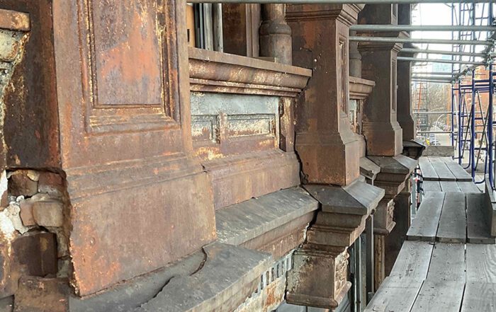 Allen Metals is proud to have had a role in this award-winning project. Our team restored the exterior ironworks, including the window well railings, posts, window grilles, and a cast iron stair unit. Inside the building, we undertook sheet metal repairs, replication, and finishing of the coffered beams and atrium cornice, preserving the architectural integrity of this historic landmark.